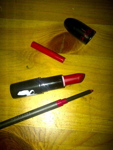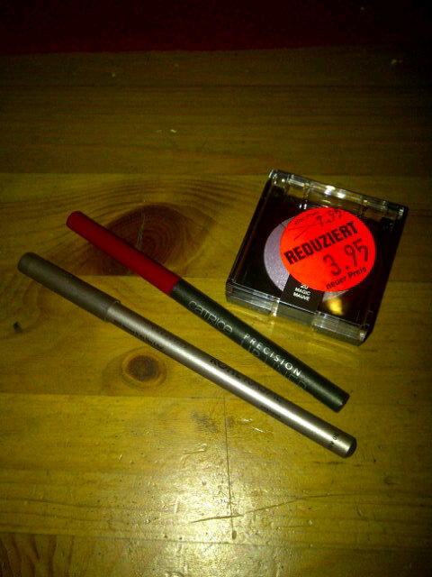 Und zwar hab ich einmal einen roten Lip Liner, einen grauen Kajal und einen gebackenen mauve-farbenen Lidschatten gekauft.